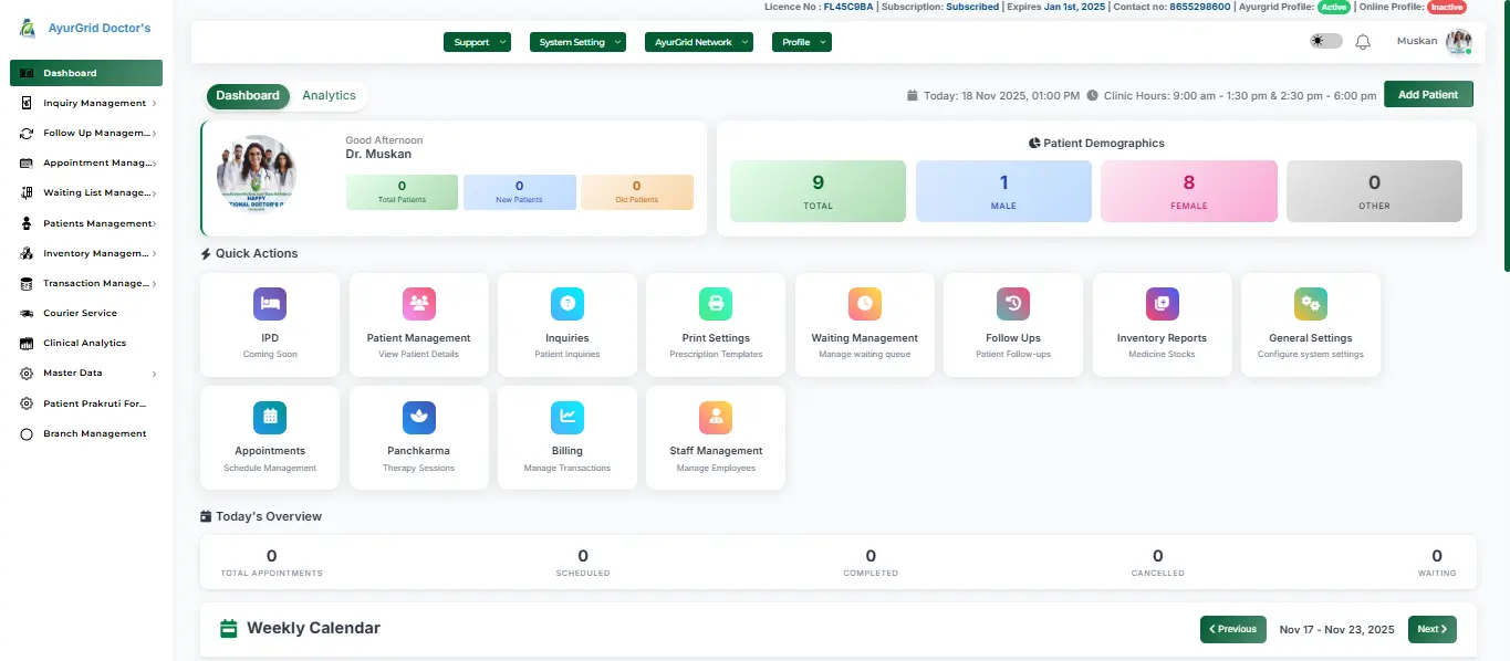 AyurGrid is an all-in-one clinic management software designed specifically for Ayurveda, Panchakarma, wellness, naturopathy, and physiotherapy clinics.